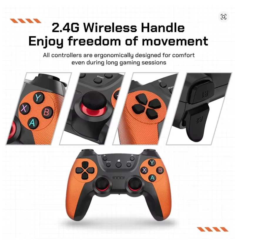 Experience the thrill of gaming with friends and family using the two 2.4GHz wireless controllers included with the Retro Game Stick. These ergonomic controllers are designed for long gaming sessions with a comfortable grip and minimal latency, ensuring smooth and responsive play. Enjoy the convenience of wireless gaming without tangled cords, allowing for flexible play spaces up to 30 feet from your screen. The X10 pro retro game stick supports two-player gaming.