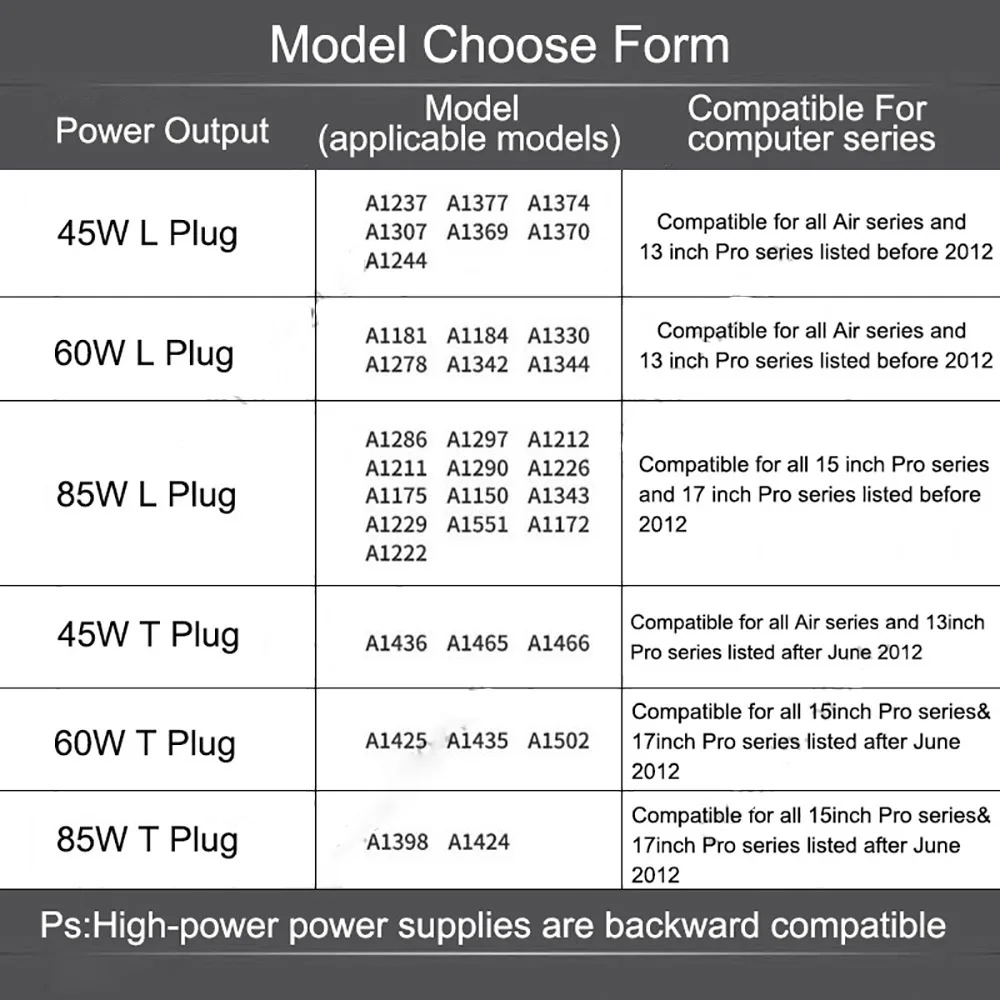 Product Name: For Macbook Pro / Air  Laptop power adapter Charger parameter: INPUT:AC 100-240V~1.5A 50~60H OUTPUT : 45W: 14.85V  3.05A                   60W: 16.5V  3.65A                   85W: 20V  4.25A Conditions: New Quality Grade A QC:TEST 1 by…