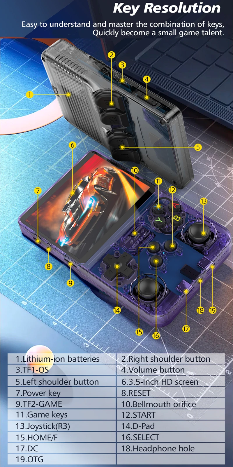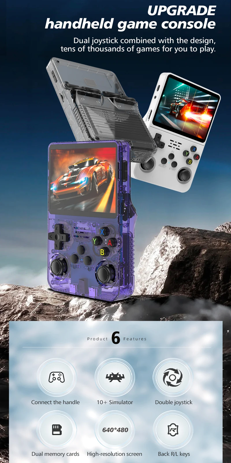 Parameters: System: open source Linux system Built-in emulator: support MAME/N64/PS1/NEOGEO/ /FC/SFC/MD/CPS1/CPS2/CPS3/ , etc. Screen size: 3.5-inch IPS OCA full lamination MIPI screen Resolution: 640*480 CPU: RK3326, ARM 64bit quad-core Cortex-A35 CPU up to 1.5GHz GPU: Mali-G31MP2 (520MHz), support OpenGL ES 3.2 Speaker: Built-in 8W cavity speaker Battery Capacity: 3000mAh Battery…